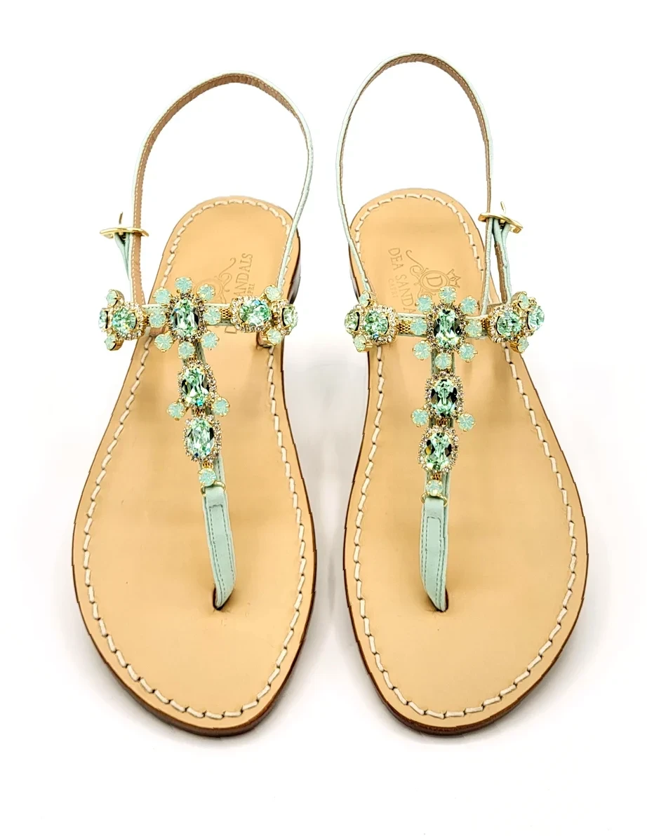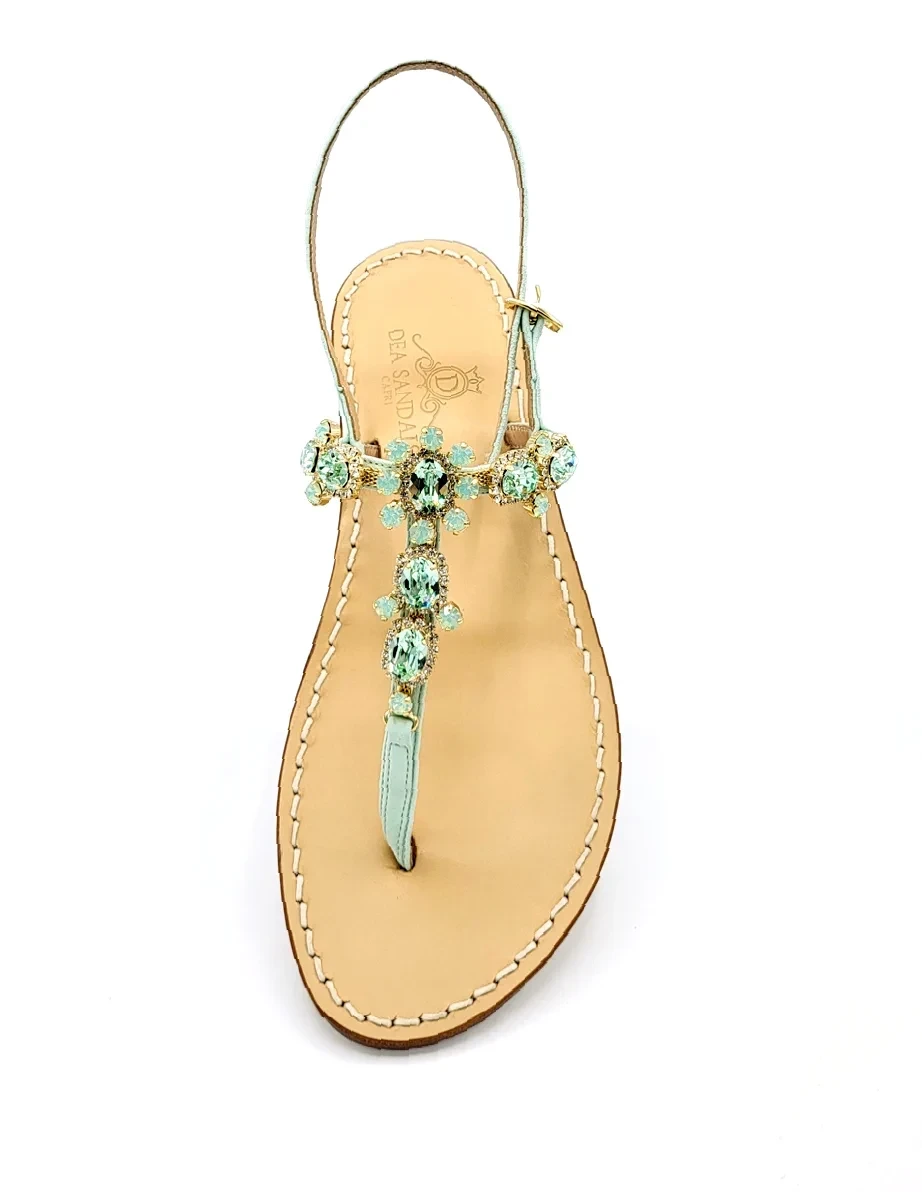 Dea Sandals CapriVia Krupp Jeweled Sandals with water-green suede straps, natural leather sole, leather heel, and a jeweled accent featuring water-green crystals and natural crystals. Features Swarovski crystals with a certificate of authenticity.