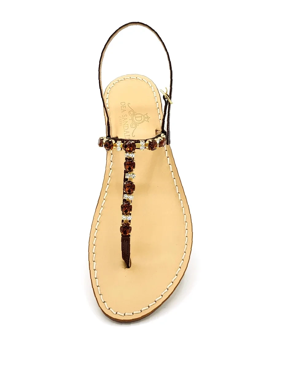 Sandali Gioiello Capri Axel listini in pelle laminato Tabacco, suola in cuoio naturale, tacco in cuoio, accessorio gioiello con cristalli Tabacco e natural crystal. Accessorio con Cristalli Swarovski con certificato di garanzia..