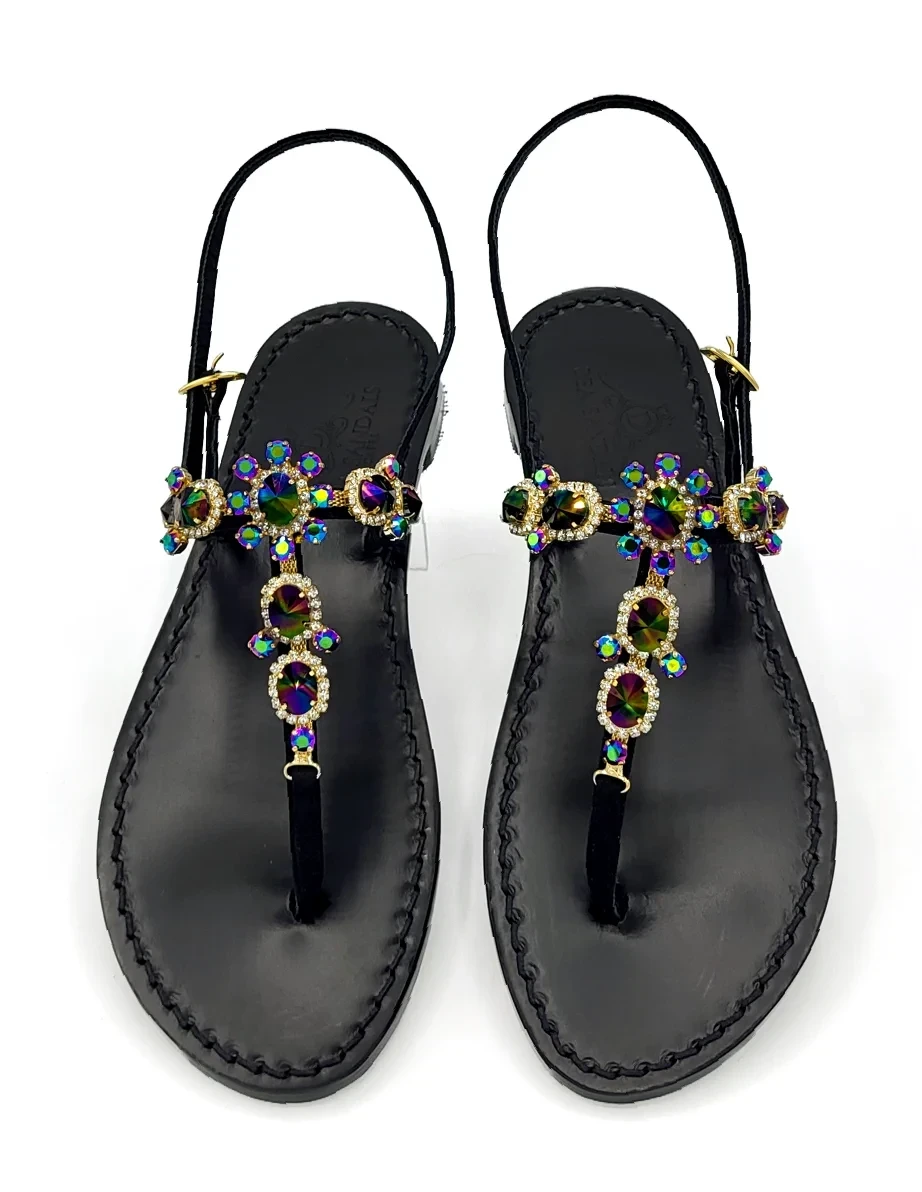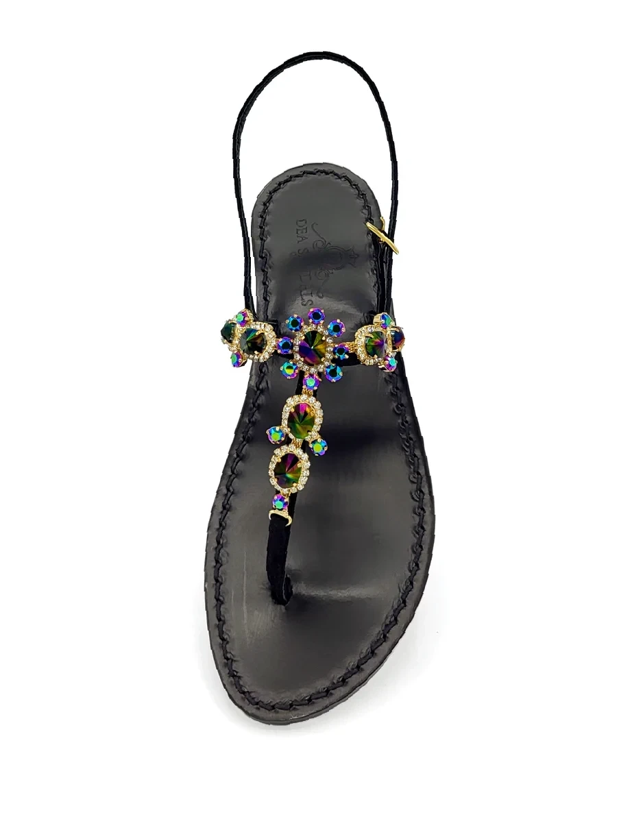 Sandali Gioiello Via Krupp listini in camoscio nero, suola in cuoio nero, tacco in cuoio, accessorio gioiello con cristalli nero raimbow e natural crystal. Accessorio con Cristalli Swarovski con certificato di garanzia.
